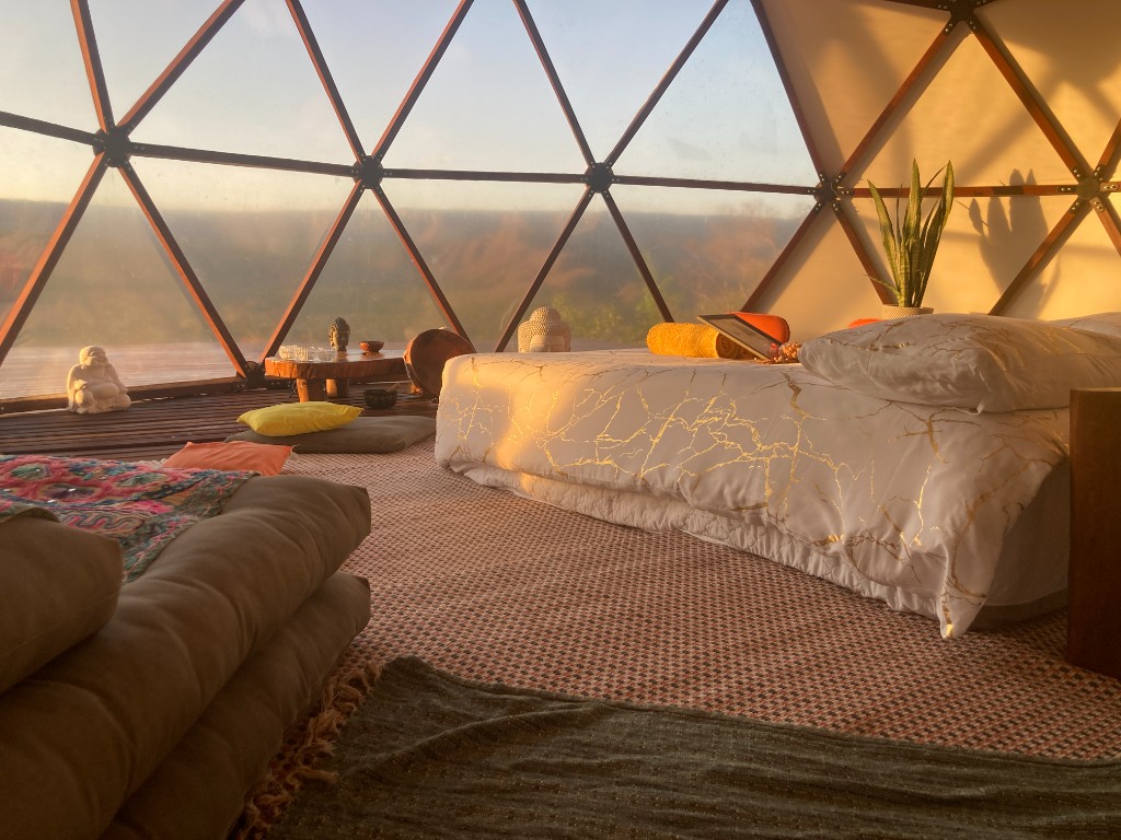 O Domo Xangô (Estadia) é uma hospedagem em domo geodésico próxima a Alto Paraíso de Goiás, com coordenadas fixas para navegação e experiência imersiva no cerrado: silêncio, luz dourada e vista ampla a partir do deck e das aberturas do domo. O espaço é pensado para poucas pessoas por vez, priorizando conforto, privacidade e conexão com a paisagem — um contraponto a pousadas lotadas no centro urbano.